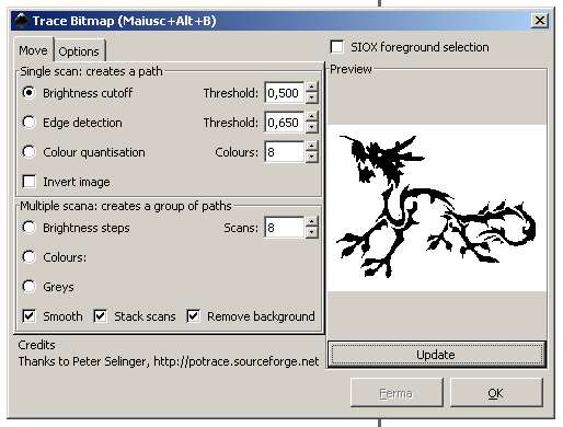 Adjusting the "Brightness reduction" threshold you can optimise the resulting image; the update button helps getting an idea of the result before confirmation; click OK. By doing this, you´re taken back to the drawing,where a vectorial copy was layed over the original image; move this away (Pic.5) and delete it by pressing "del" (in case you remove the wrong one, the always handy CTRL-Z undoes the last operation).