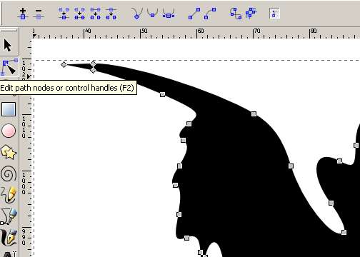 zoom the area of the image to work on and select in the left buttons panel the one for modyfying the path´s nodes (shortly, nodes are points on the image edges carrying curves and corners informations), as shown on Pic.6:
