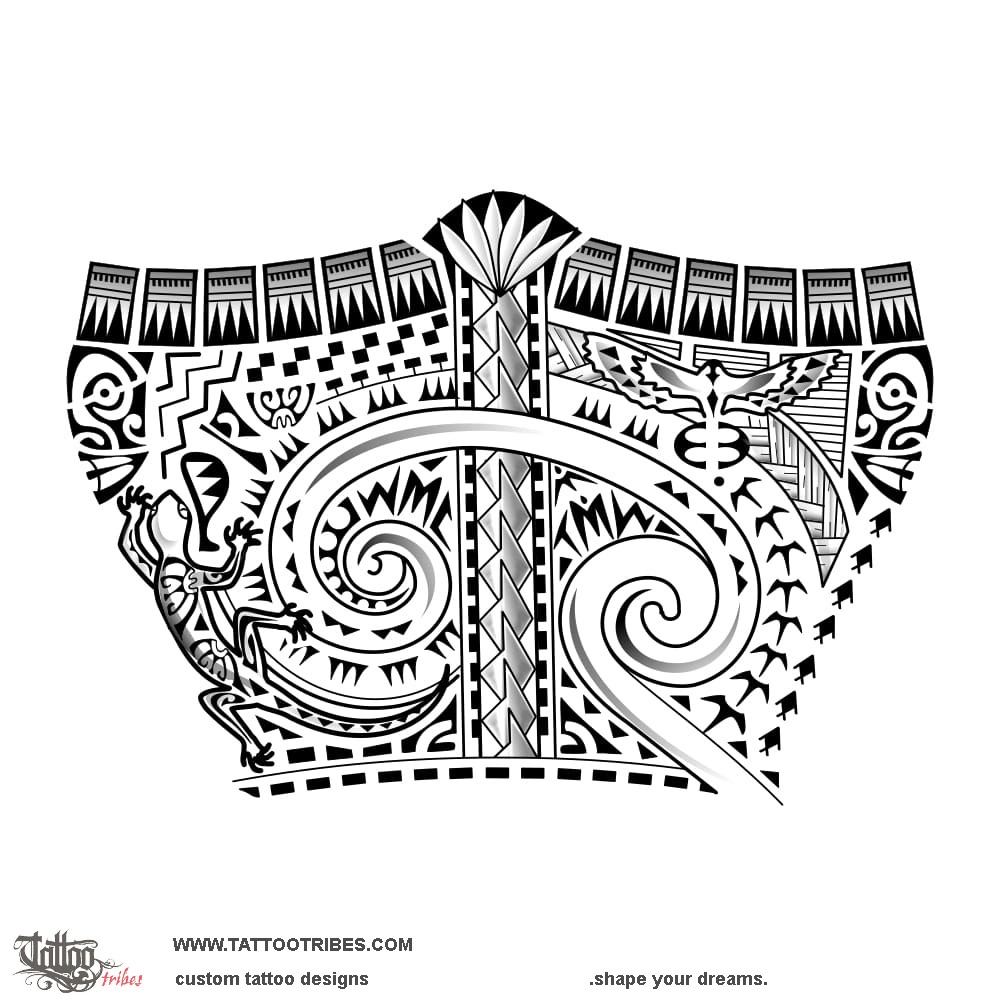 The lizard and the two tiki on the sides protect family, while the path to knowledge, the adze, and the mere represent the values they teach to their son: honor and respect, skills and creativity, and service supporting people through their challenges (the path of Kamehameha).