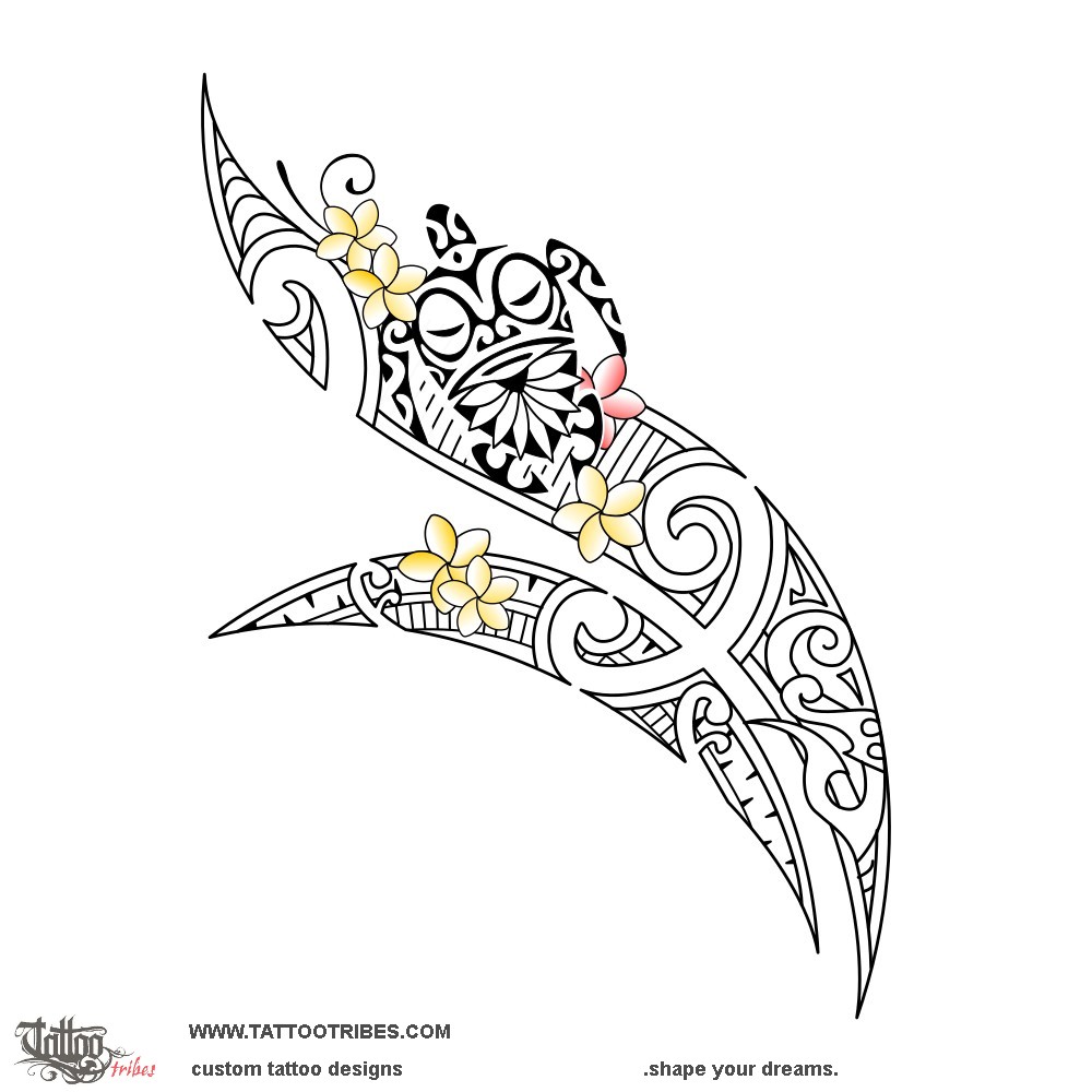 Several plumeria flowers surround the turtle, and the koru symbolizef life and new beginning.