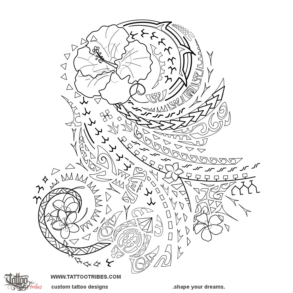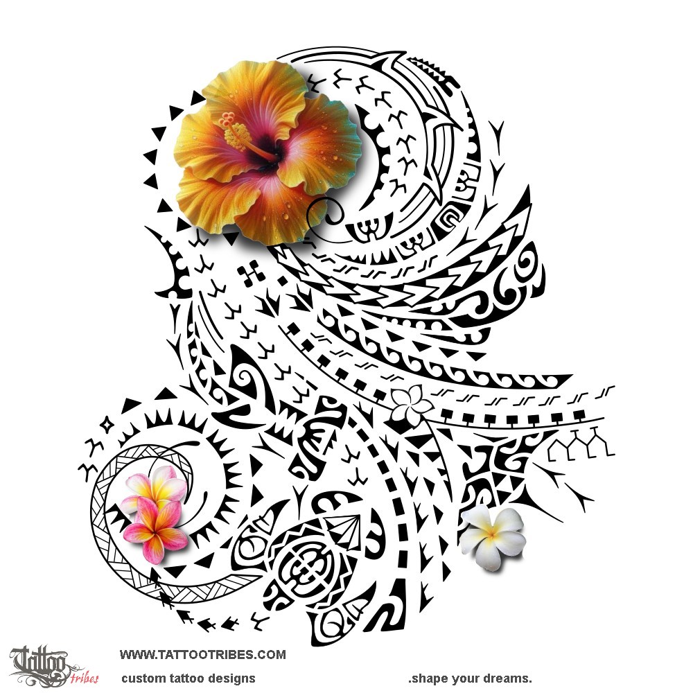 The flower of hibiscus on the shoulder also represents Heike's daughter, who has always been a fixed point through all the hard times (thorns and path of Kamehameha), always faced with adaptability, strength, and determination (the shark teeth, hammerhead shark, and spearheads).