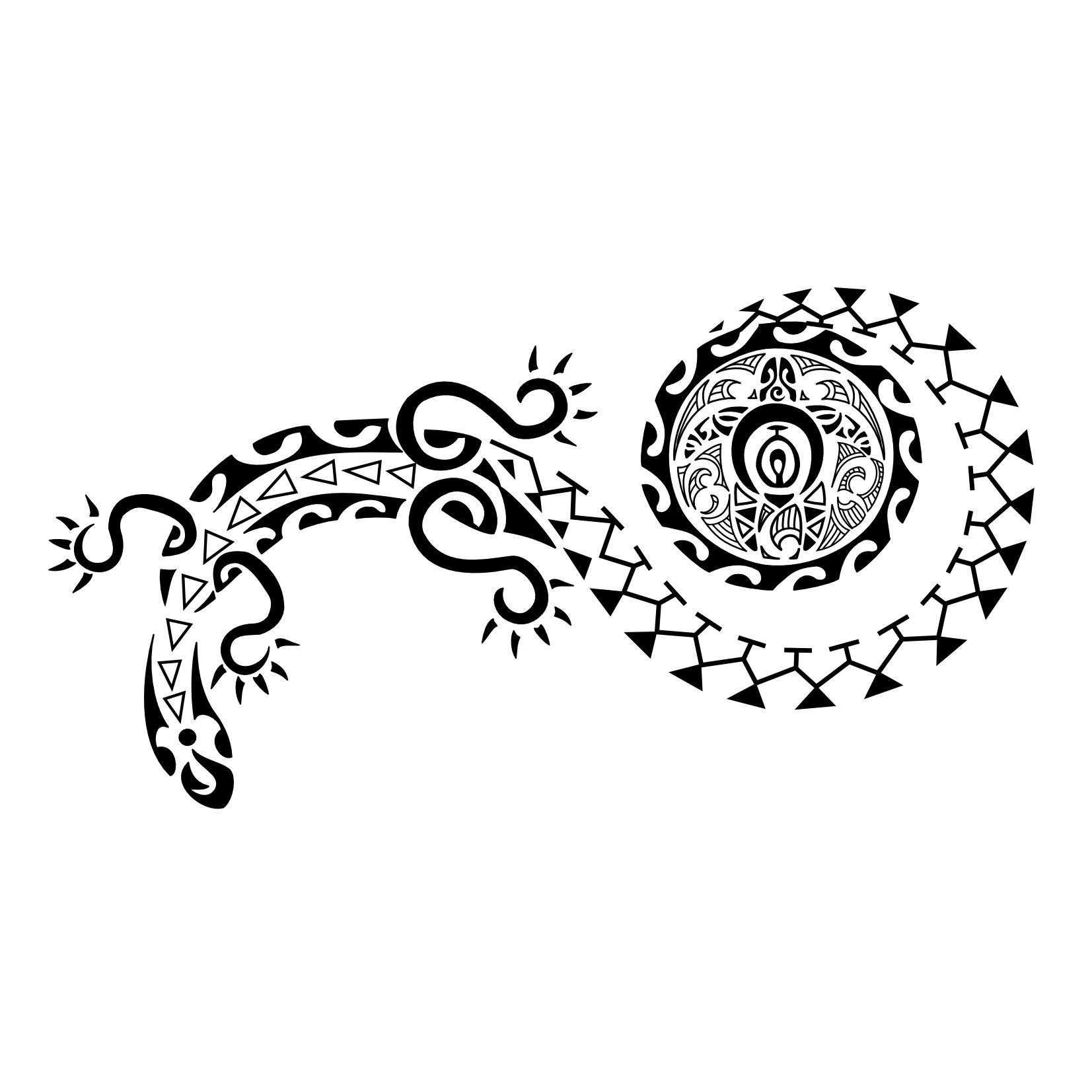The sun represents eternity, life, and in its center the turtle symbolizes family. The front fins are formed by two tikis, to protect the family from every direction, and we placed two korus (new life) around the turtle and one in its head for the children, whose names starting letters, B, L and R, are placed below the tikis and between the back fins. "The all-seeing eye" forming the shell is a strong symbol of protection. The spiral motif of the turtle shell and shark teeth wants to symbolize a voyage for which much strength is needed. Waves mean change and the lizard (good luck) has the fish hook (abundance) and island symbols on its muzzle as a wish for finding a personal joyful island.