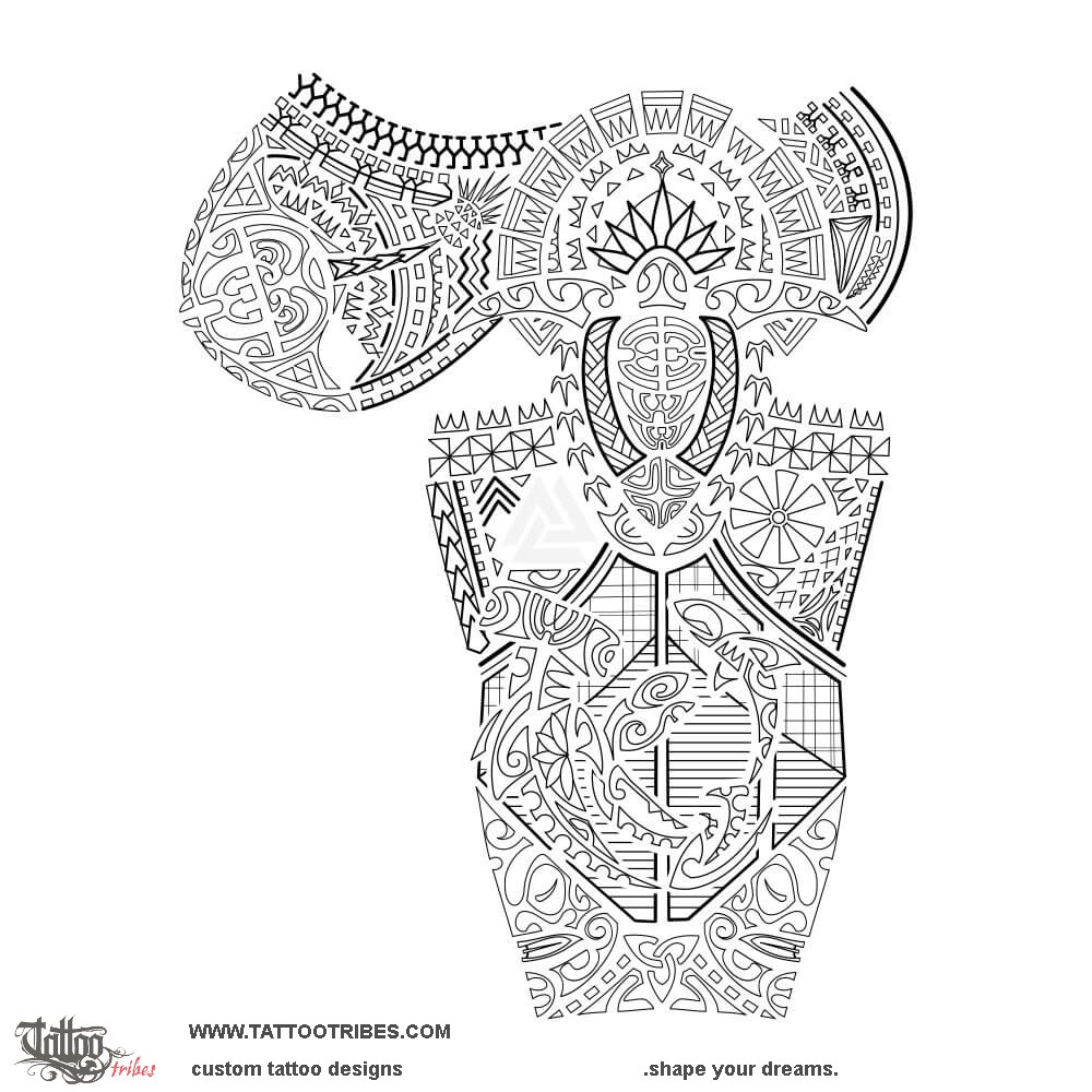 The manta on the pec symbolizes freedom, and it includes the warrior and a tiki (the protector of the family).