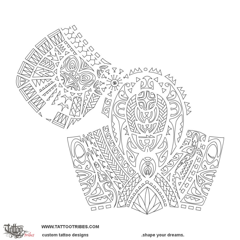 The center of the shoulder is entirely covered by the turtle representing family, with a warrior on the shell supporting his two daughters (the braid represents family unity) and providing them with serenity (the Marquesan cross representing balance and harmony).