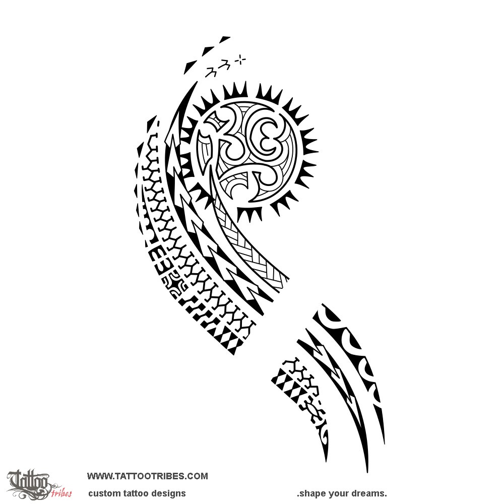 The sun going on the shoulder encircles the initials K, B, and T designed as maorigrams.