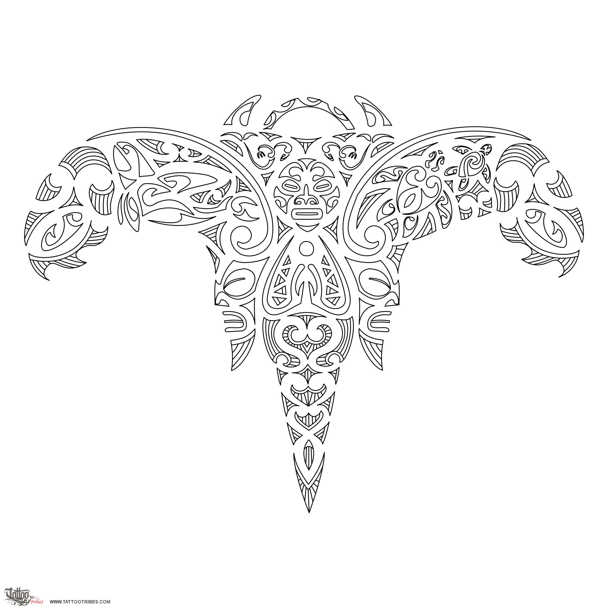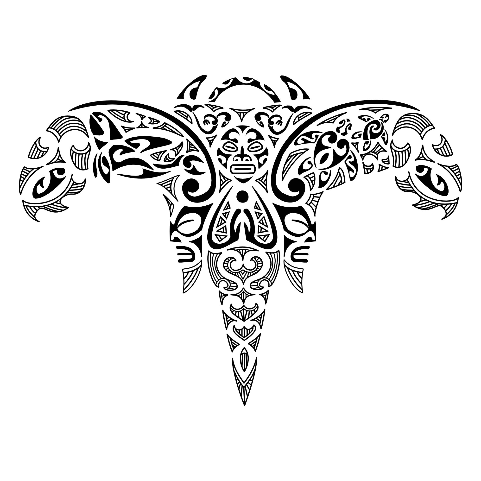 This drawing of a Maori styled angel takes up the shape of a manta to symbolize protection and freedom. Again protection, and fertility, is represented by the two tikis inside the lower part of the wings, and the two manaias inside the upper part are two guardian angels themselves, symbolizing balance and harmony between sea, earth and sky. Another important element is family (the turtles inside the right wing and the killer whale on the left wing); in particular, the orca symbolizes family and the will of protecting it with strength when necessary. The fish hooks on the wings ends symbolize abundance and wealth. The koru motifs indicate a new birth, along the path that leads to one´s very own island, the target to be reached, represented by the spot that the angel fosters in his hands.