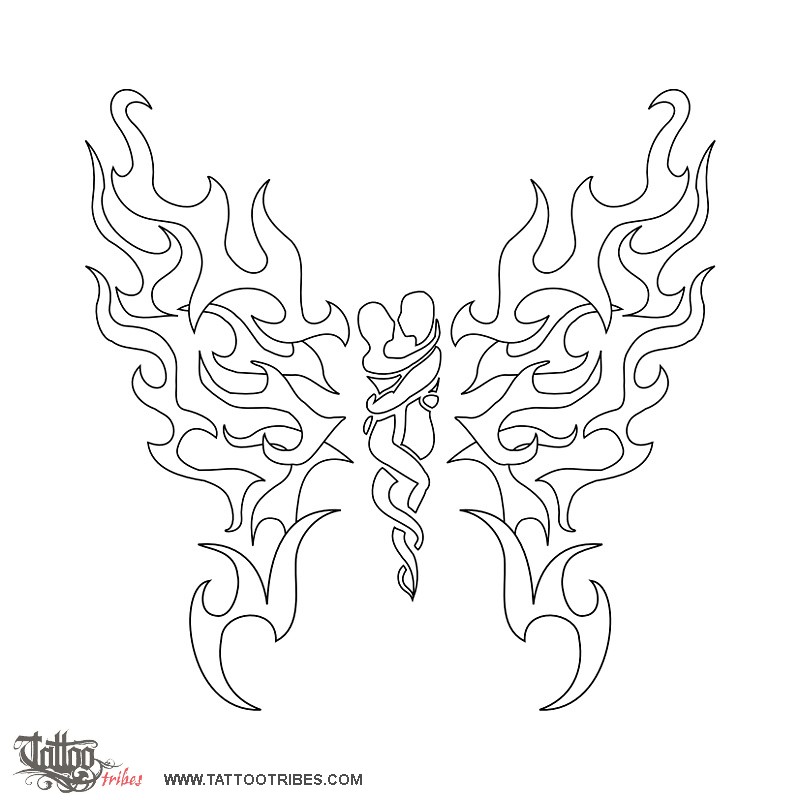 Michelle requested a tattoo inspired to a design she saw years ago, of a butterfly made by two people in a hug, with wings made of fire, this because of her husband being a Volunteer Firefighter.