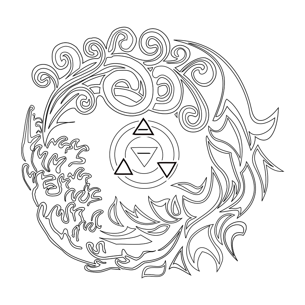 Elements, in this case the four classic ones (earth, air, water and fire), are strictly connected with each other, in a balance that´s the basis of everything. The symbols inside this design are the symbols of the 4 elements themselves, starting from the central main one that represents earth, to the three surrounding ones representing the related nearby elements.