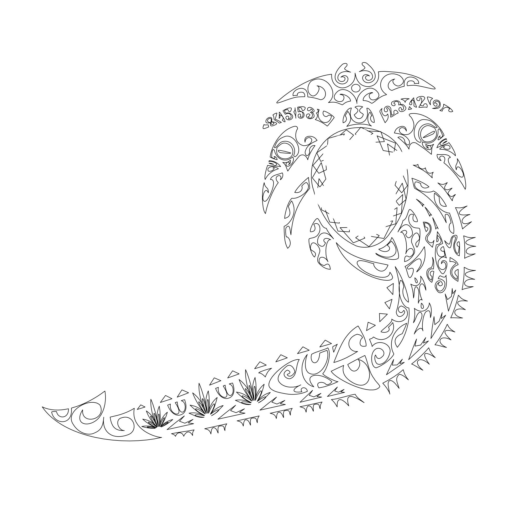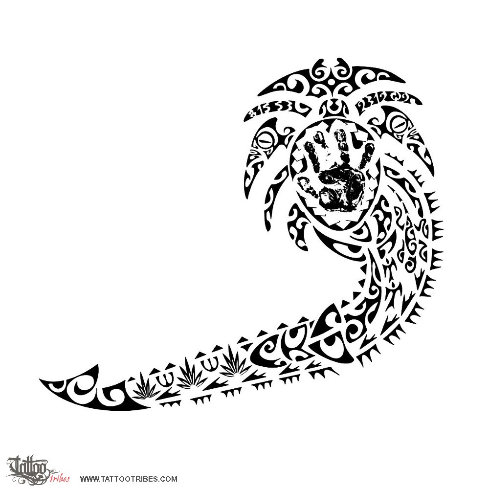 Polynesian tattoos explainedWe placed the hand of his daughter in the center to represent her centrality, and we included it into a turtle shell to symbolize the importance of the whole family, of which she is now the center, through every change (the waves between the flippers), whilst the spear heads motif surrounding it symbolizes the warrior, the strength and protection to always defend her.