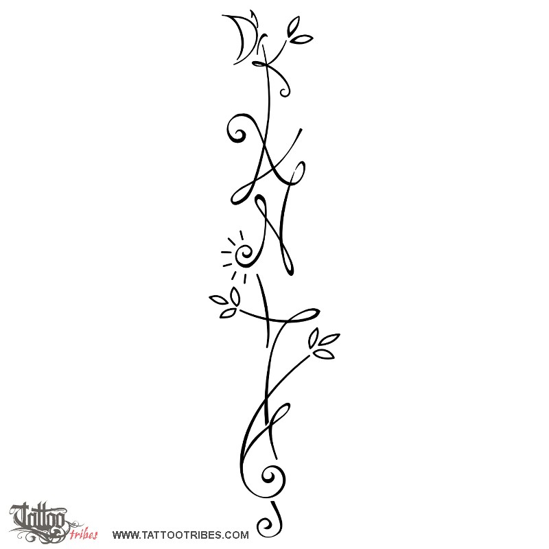The name Anita written from top going down has myrtle leaves decorating the lines (faithful love) and the dot of the letter i being a small stylized sun (positivity, joy and eternity).