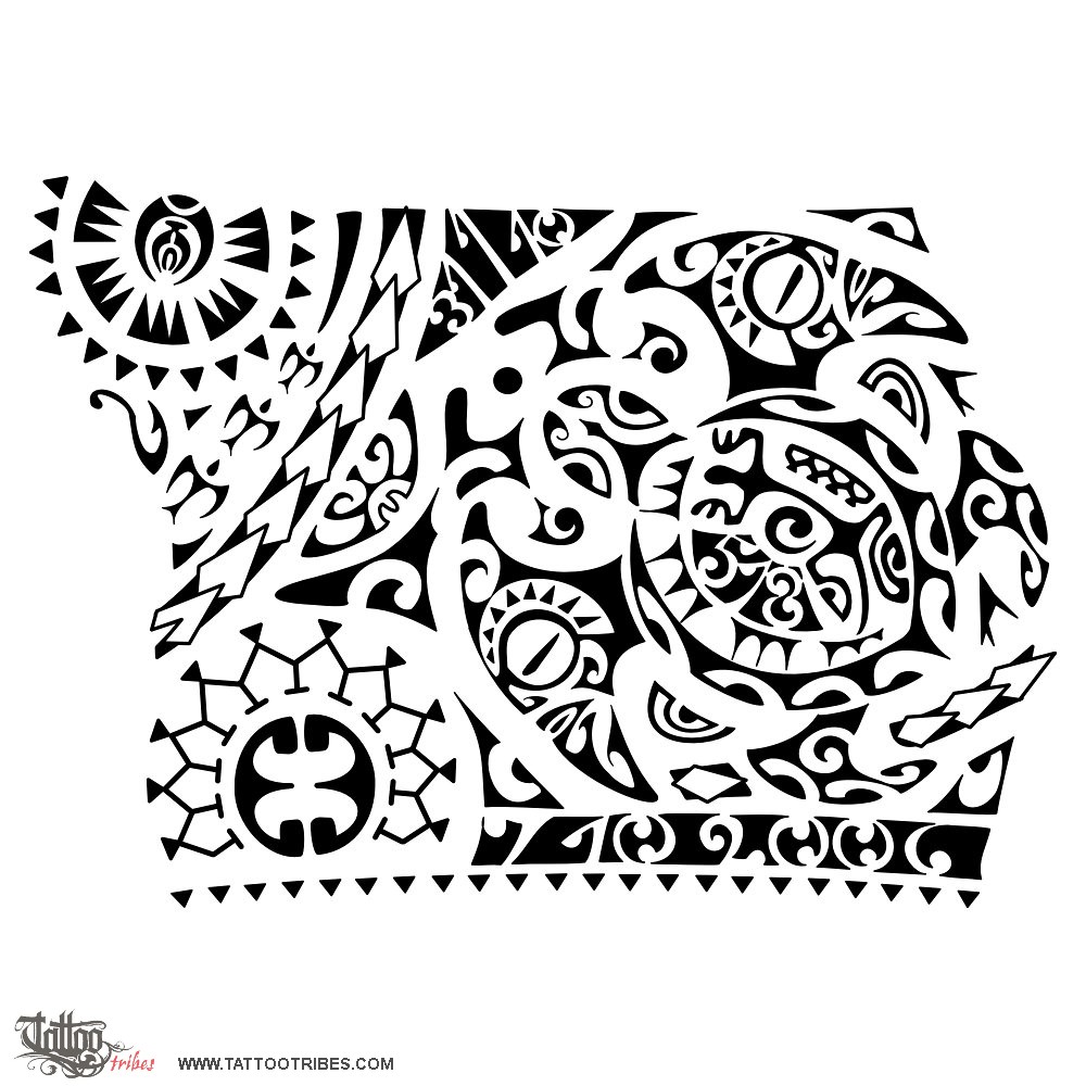 Just above, on the right pointing upwards, we placed the turtle symbolizing family, with two tiki as the front flippers to guard on them from every side. On the shell, a koru (new life) represents his son, surrounded by a lizard (luck, protection) and by a sun, with a maorigram of his birth date (5 1 8).