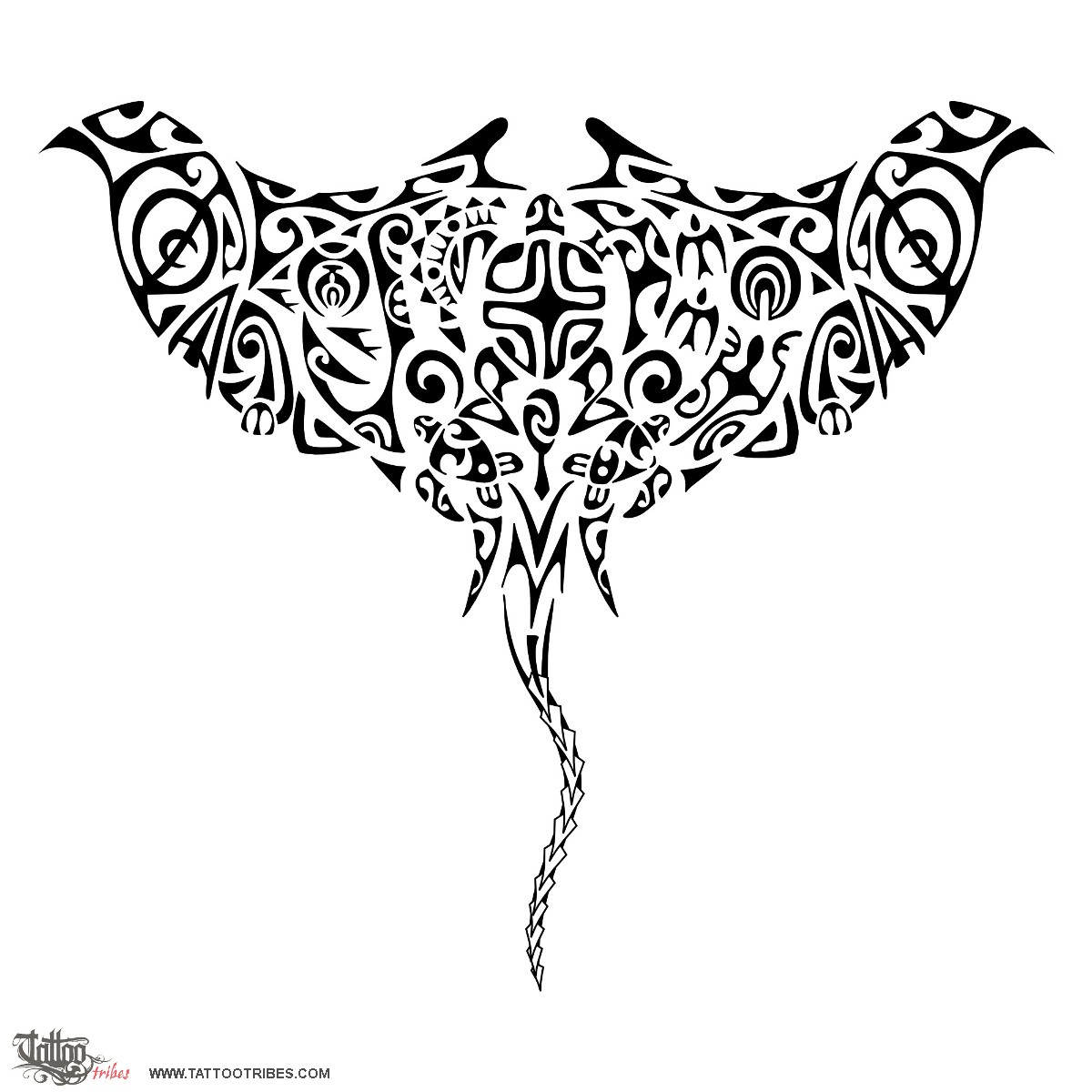 Two tikis are on the tips of the wings for protection on all sides and waves shape the upper and lower edges of the manta.