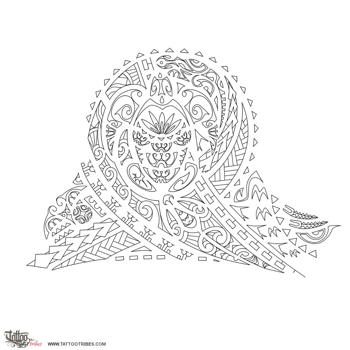Centrally on the shoulder we placed a turtle, to symbolize the importance of family for Michael, who requested this tattoo. The front fins of the turtle are tikis to protect his family from all sides. The lower element on the shell of the turtle represents him, with his wife nearby. He supports his wife and together they support their three children just above. Their union gives stability to the family (the mountains on the sides) and joy (the sun above the five of them, incorporating a flax plant with five leaves which is yet another way to represent family). The two chasing birds closing the upper part of the shell and making the head of the turtle symbolize that help will always be granted to the dear ones.