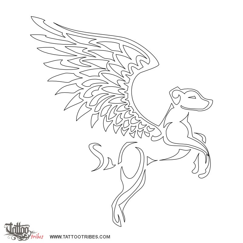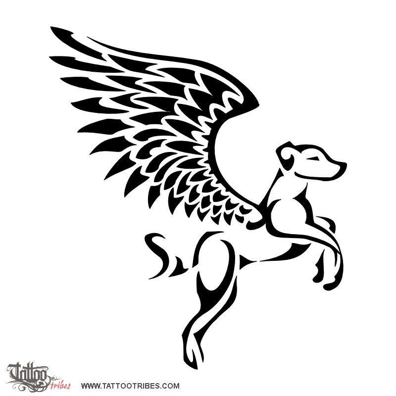 This tattoo of a winged dog about to take flight was requested by Marco and it contains a letter S in the tail in memory of a fellow of many an adventure.