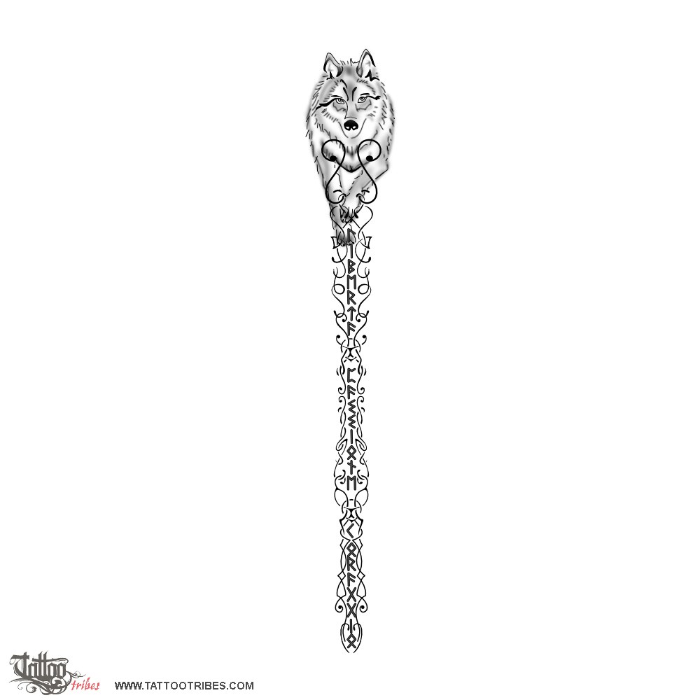 Elisa requested a tattoo developing along her spine containing a wolf seen from front, in a realistic style, surmounting three words transliterated using the Elder Futhark runes surrounded by elements like spirals and waves.