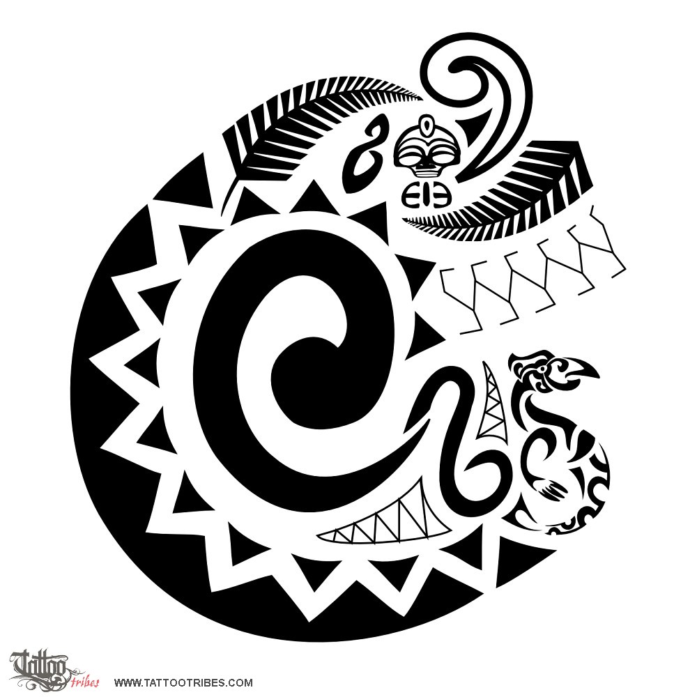 This tattoo, requested by Clemente, represents some important moments in his life, clockwise from the bottom: from the darkness, helped by the manaia, or guardian angel, to the sunlight, with the zodiac sign of the lion becoming a koru, symbol of new life; reaching maturity (adult fern), with love (the twist) and fertility (tiki) which, through the encounter with another person (the second fern), gave life to Arianna (which means "pure", as the light colour of her koru symbolizes). The turtle shell motif symbolizes the voyage of his life, which will in the end take him back where he started, passing from sunlight to darkness under the protection of his guardian angel.