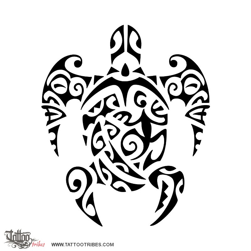 The right back flipper is a fish hook (prosperity) while front flippers are tikis for protection him from all sides.