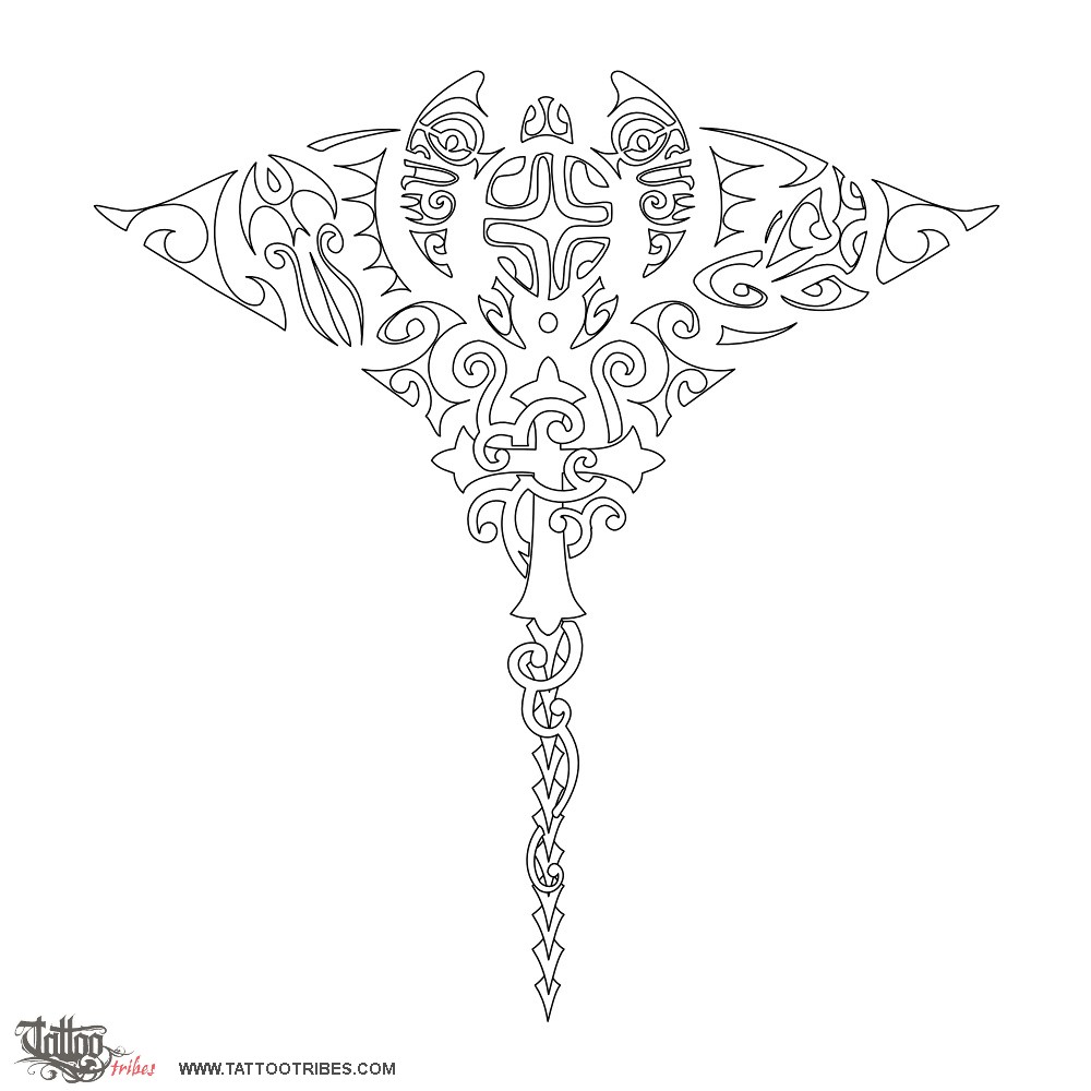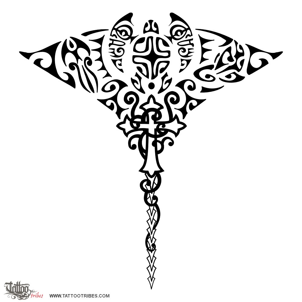 This manta tattoo joins two different crosses and styles: the Marquesan cross, representing balance and union of the elements, and a Christian cross that becomes the tail of the manta turning into spear heads (strength) while the dot between the two crosses (faith and nature) represents their importance.