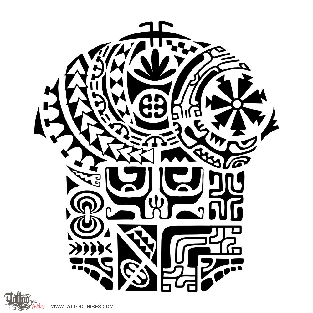 The centipede and spear heads symbolize the warrior facing adversities (the moray eel) to reach success and serenity (the sun and Marquesan cross towards the future).