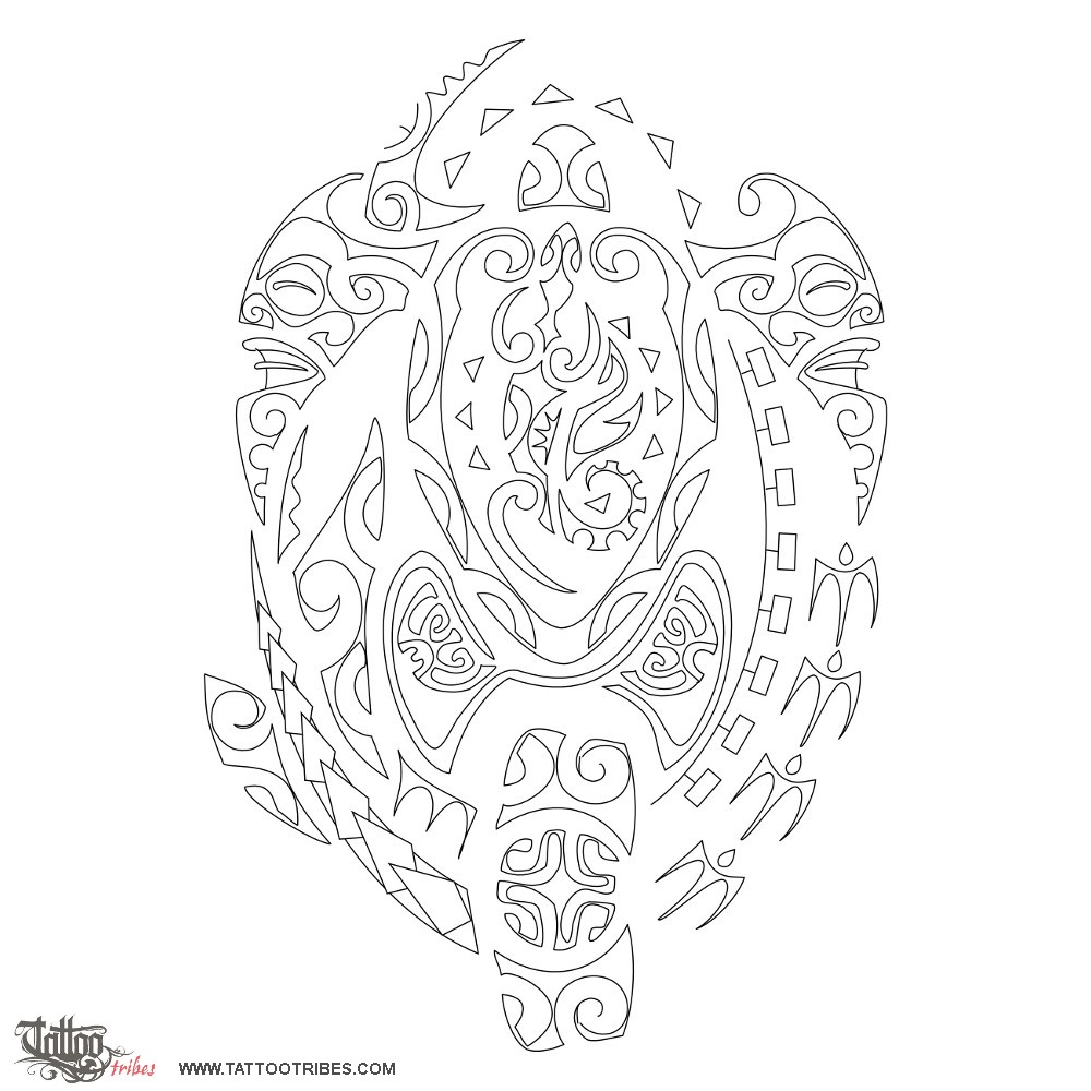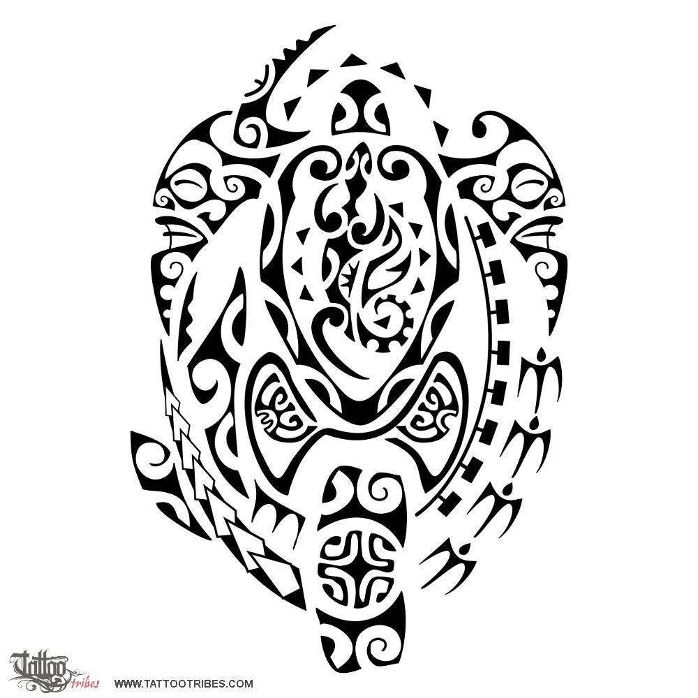 Polynesian tattoos explainedThe turtle (family) is central, protected by the hammerhead shark on its left and by tikis on its front flippers.