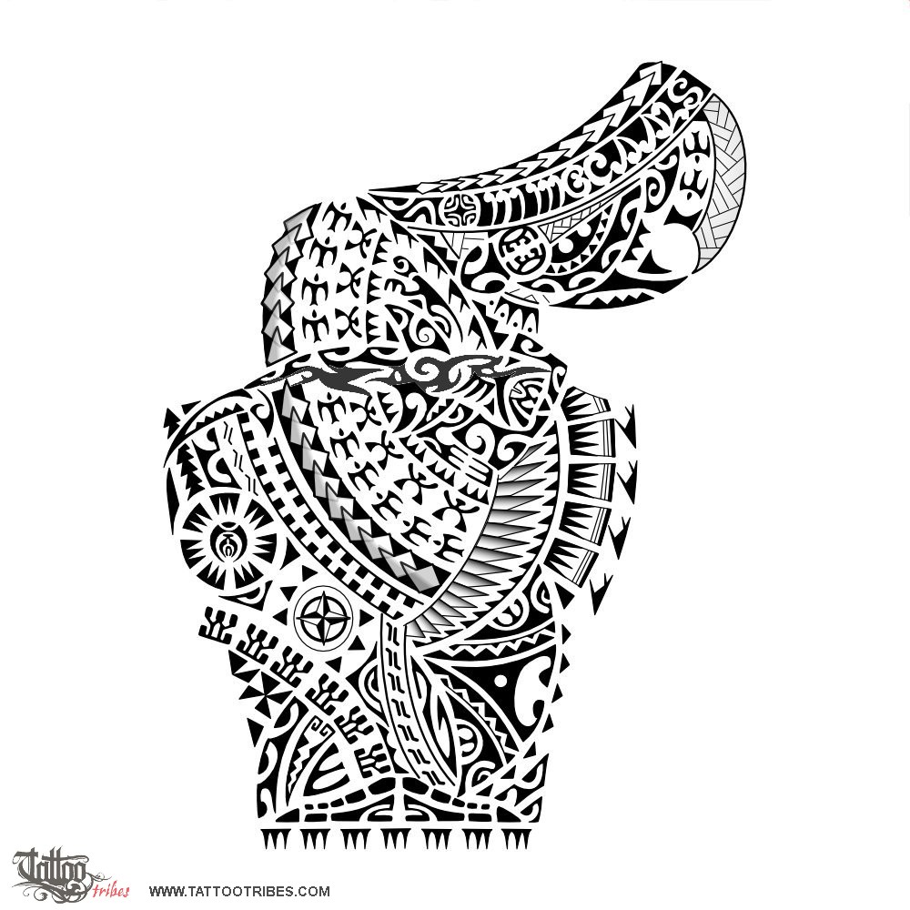 On the pec, close to the heart, the turtle symbolizes family, with the headletters of the family members placed above it as maorigrams.