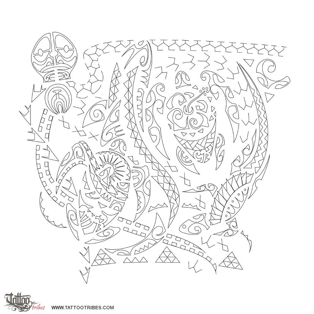 The octopus tentacle closing the tattoo on top is the ani ata motif representing ancestors guarding upon the family while the remaining tentacles are made of birds (voyages, higher perspective), mountains (stability), fish (prosperity) and the path of Kamehameha (hard path that leads to success).