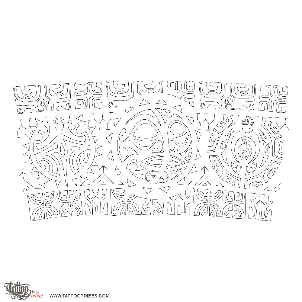 The upper band has tiki and Marquesan crosses for protection and balance while the lower one has sugar canes and lizards for prosperity and good luck.