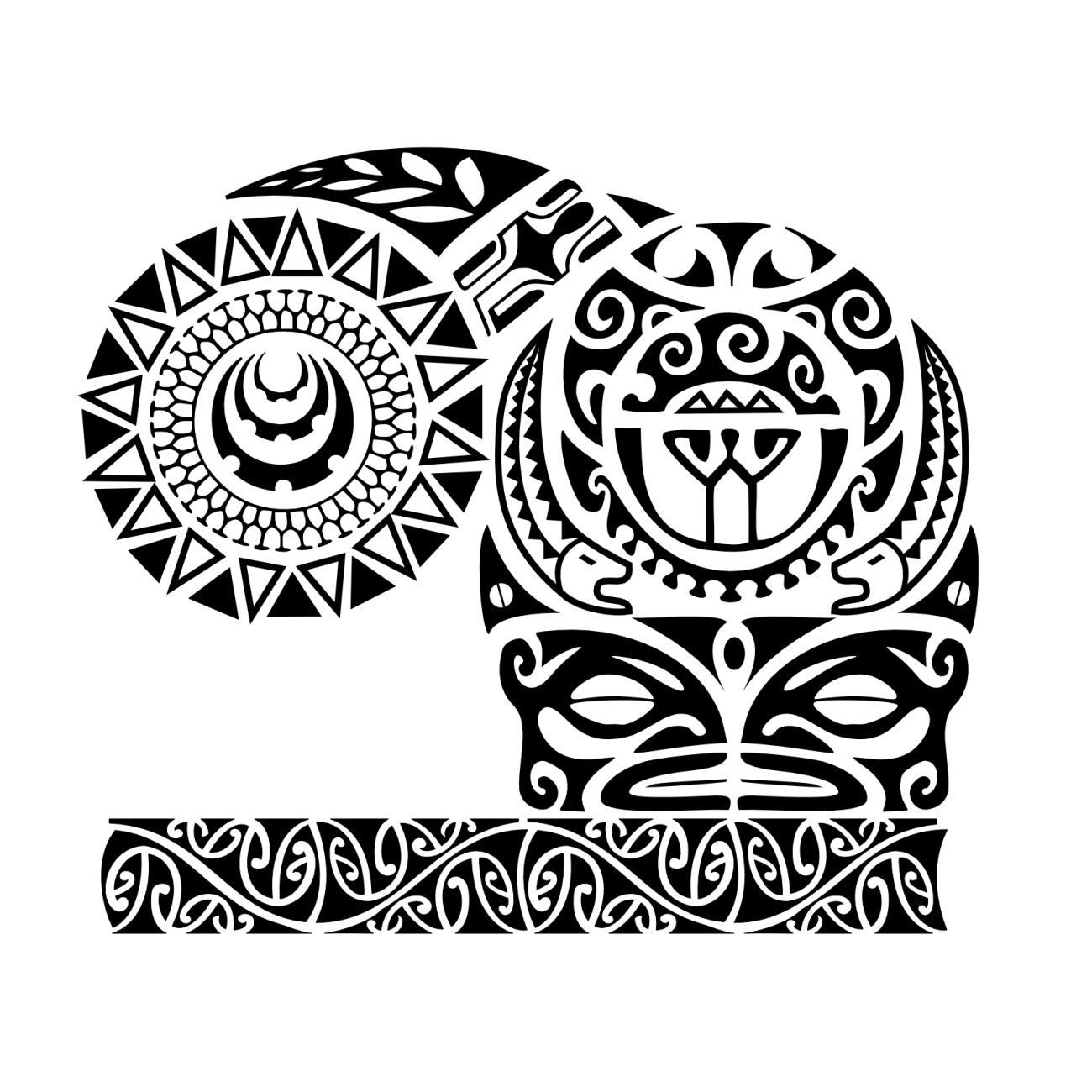 We called Kaha this desing requested by Bjoern on account of several elements in it that enforce this idea of quiet strength: the traditional hammerhead motif of the armband indicated strength and tenacity, and the eels recall the fight won by the warrior Maui against the giant eel moray Te Tuna. Tikis symbolize fertility and protection, on the sea and on the land, as symbolized by the waves and mountains, a protection coming also from ancestors, whose eyes are on the eels sides. The adult fern leaf indicates maturity, and the fern buds are for the descendants. Other elements symbolize good luck, family, travel and adaptability (lizard, sun, turtle, shark teeth...).