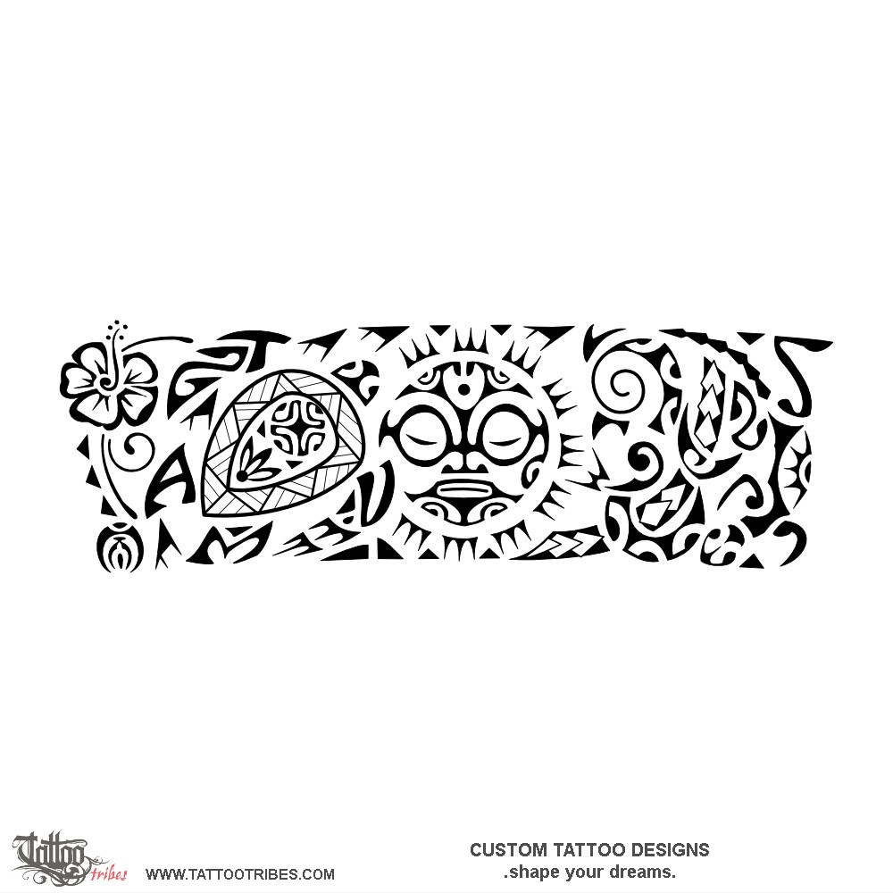 Polynesian tattoos explainedThis armband tattoo was prepared for Tony and it represents protection to his family, represented by the turtle with the family members head letters on the 4 flippers (T,V,A,M), with a braid and flax leaves for family union and a Marquesan cross for harmony.