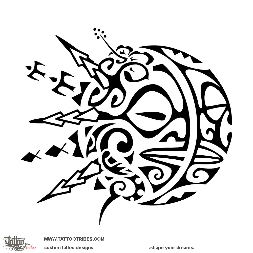 The sun and moon of this tattoo are made using two tiki for protection with the moon being a manta (freedom, harmony).