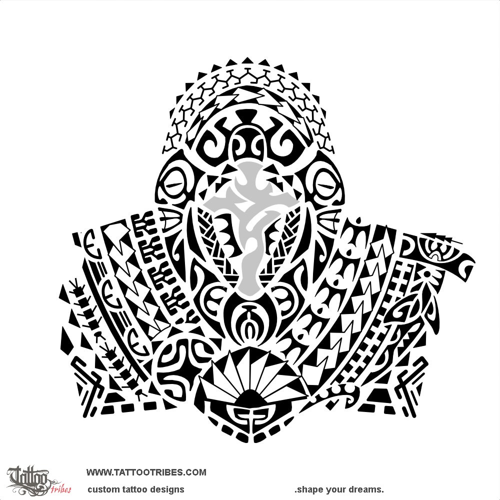 Since the cross represents his father, we integrated it into a turtle symbolizing family, with an enata guiding it surrounded by the ani ata motif representing the ancestors he now belongs to, guarding upon family and bringing joy and success (the sun surrounding the top).
