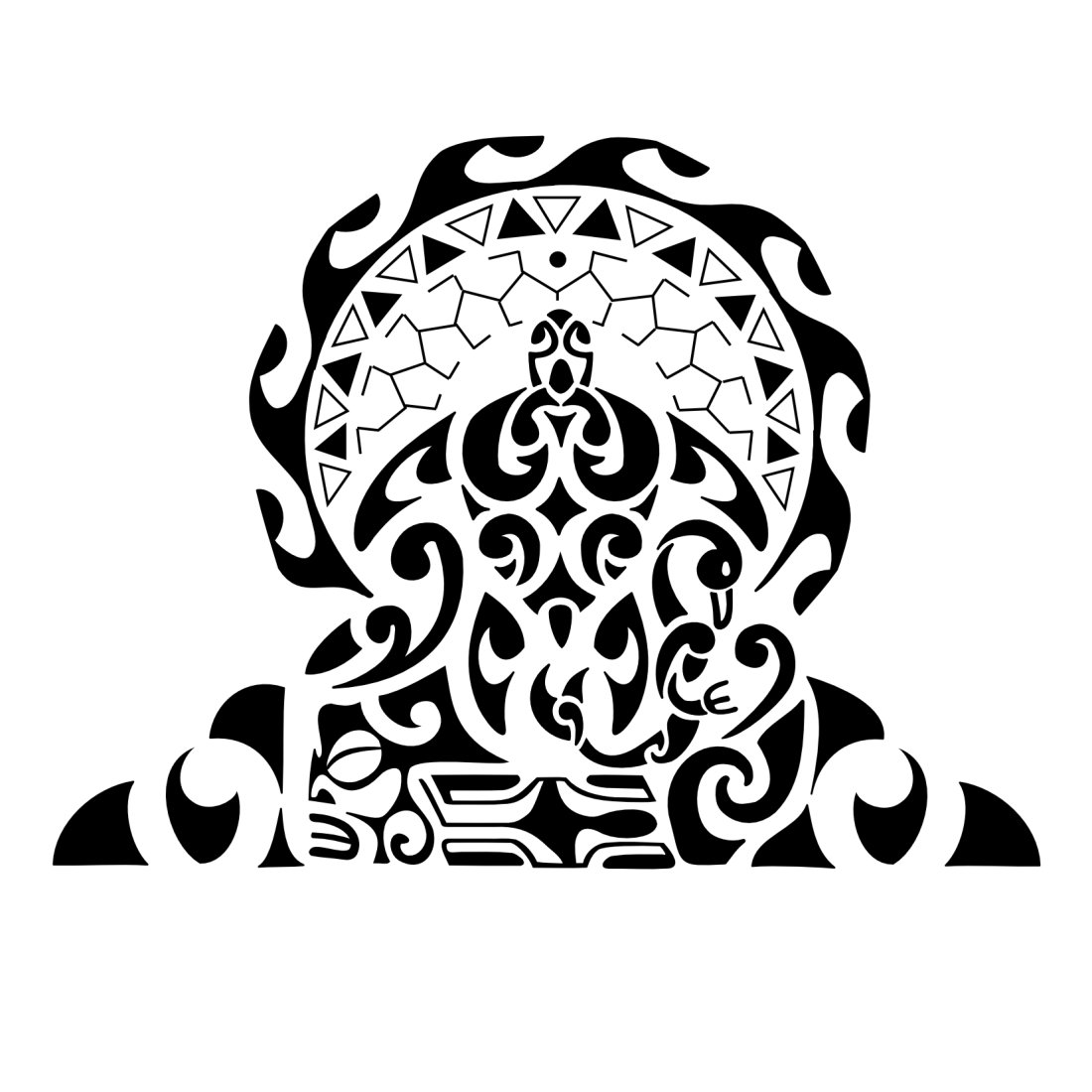 This design is called "dawn" because it wants to represent a new beginning after a sad event. The turtle indicates family, and also the navigator, travelling towards the sun and an untroubled life. The fish hook motifs stand for wealth and abundance, and the spot before the turtle is the island, symbolizing the goal that will be reached.The Te manaia on the right is the guardian angel taking a dear person with himself, and the double koru on the left stands for the descendence that will come, protected by the tiki. The lizard is a symbol of life and death and represents a wish for good luck. The shark teeth symbolize strength and tenacity and waves symbolize change.