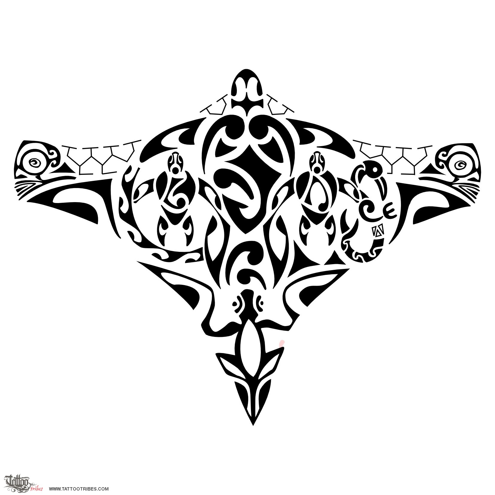 Polynesian tattoos explainedThe main turtle in the middle and the two smaller ones on its sides represent family, and we used two twists (love, eternal bond) to join their fins together to represent their reciprocal indissoluble bond.