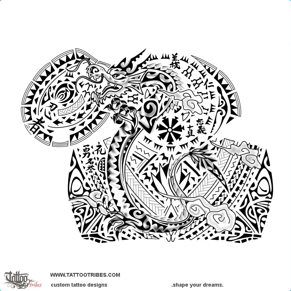 Polynesian tattoos explainedThis Polynesian halfsleeve and pec tattoo prepared for Ryan includes elements derived from Asian traditions, like the dragon and the clouds, plus some ideograms woven within the elements, like the seven ideograms for the seven virtues of bushido, each one with Polynesian symbols nearby representing that virtue: ponapona symbolizes union and loyalty, and it´s next to Chu and Makoto (for honesty and loyalty); a sun and people are next to Gi and Jin (for integrity and compassion); the mere (status, respect and honor) is next to Rei and Meiyo, and the spearheads (warrior, strength and courage) are close to Yu.
