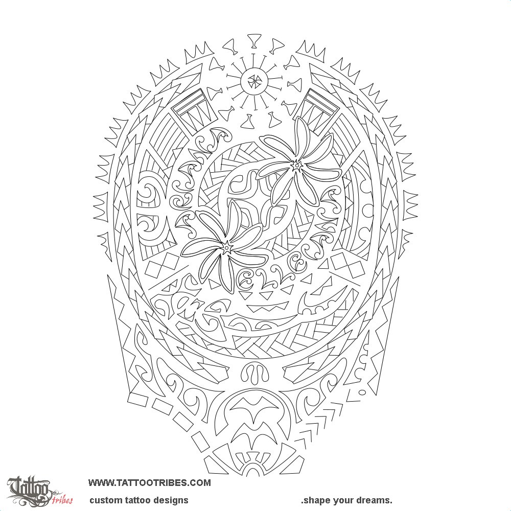 The two tiare flowers (beauty and femininity) representing his daughters are central with their names next to them to symbolize their centrality in his life, with braid for family unity, and a Marquesan cross as they give him harmony and balance.