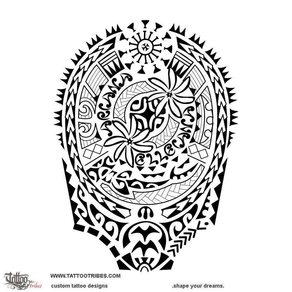 In this Polynesian shoulder tattoo prepared for Anthony, a warrior at the base has spearheads starting from him and embracing the whole design to represent protection for the elements in the middle: the turtle (family, with chasing birds on the shell to represent help always granted to the loved ones), and his daughters.