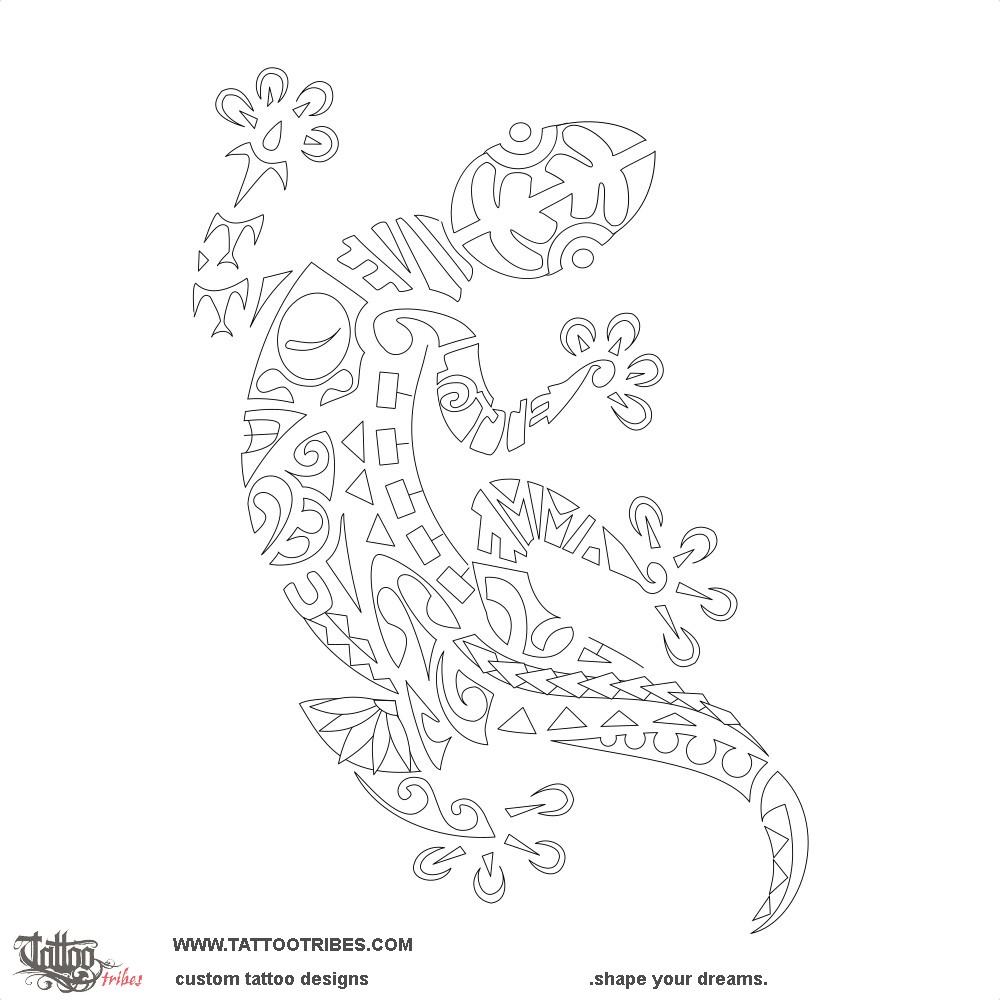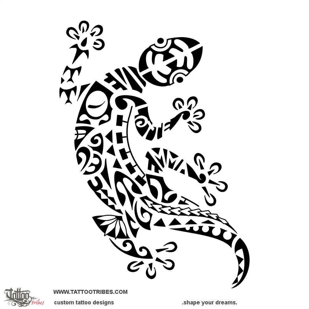 Polynesian tattoos explainedThis Polynesian tattoo of a gecko was prepared for Marko and it includes the names of his daughters and wife disguised within the right legs and next to the couple that shapes the head of the gecko.