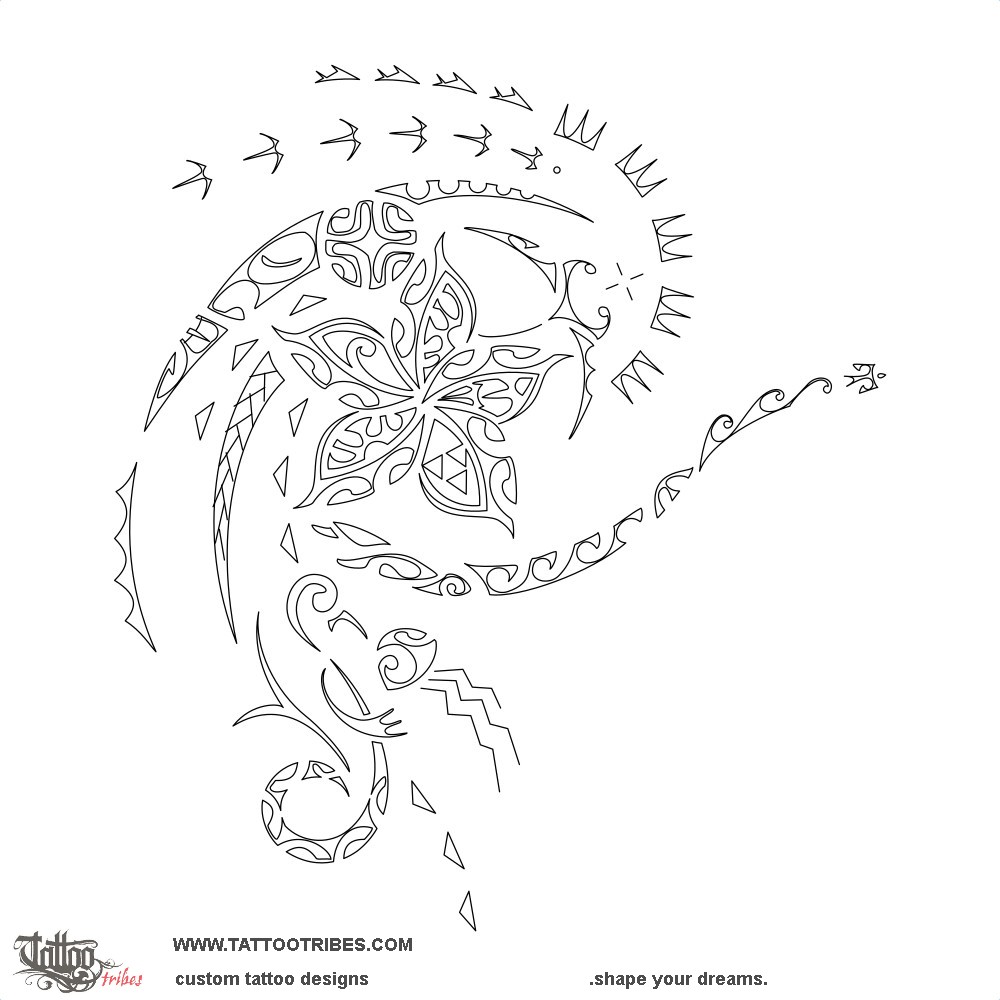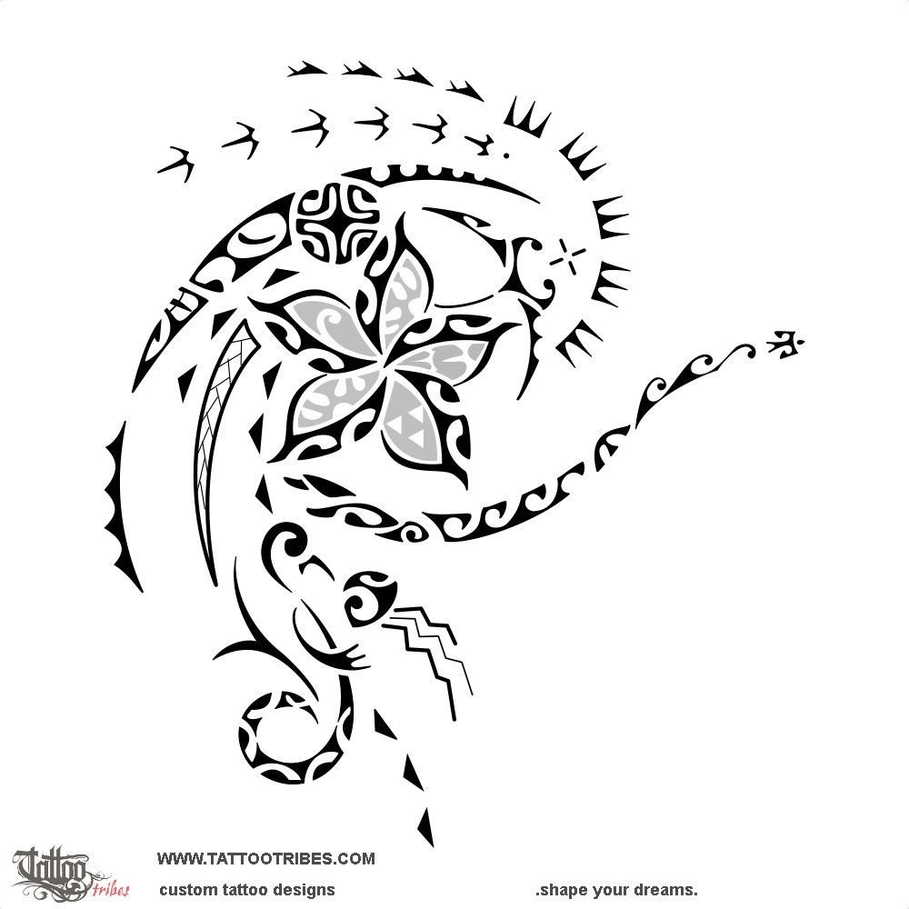 Polynesian tattoos explainedThe frangipani flower at the center of this femenine Polynesian shoulder tattoo symbolizes beauty, and what is most important for Annie, for whom it was designed, is represented in its petals: a koru for her daughter, protected between father and mother, the lokahi for harmony with nature, and two birds that chase each other to indicate help and support always granted to the loved ones.