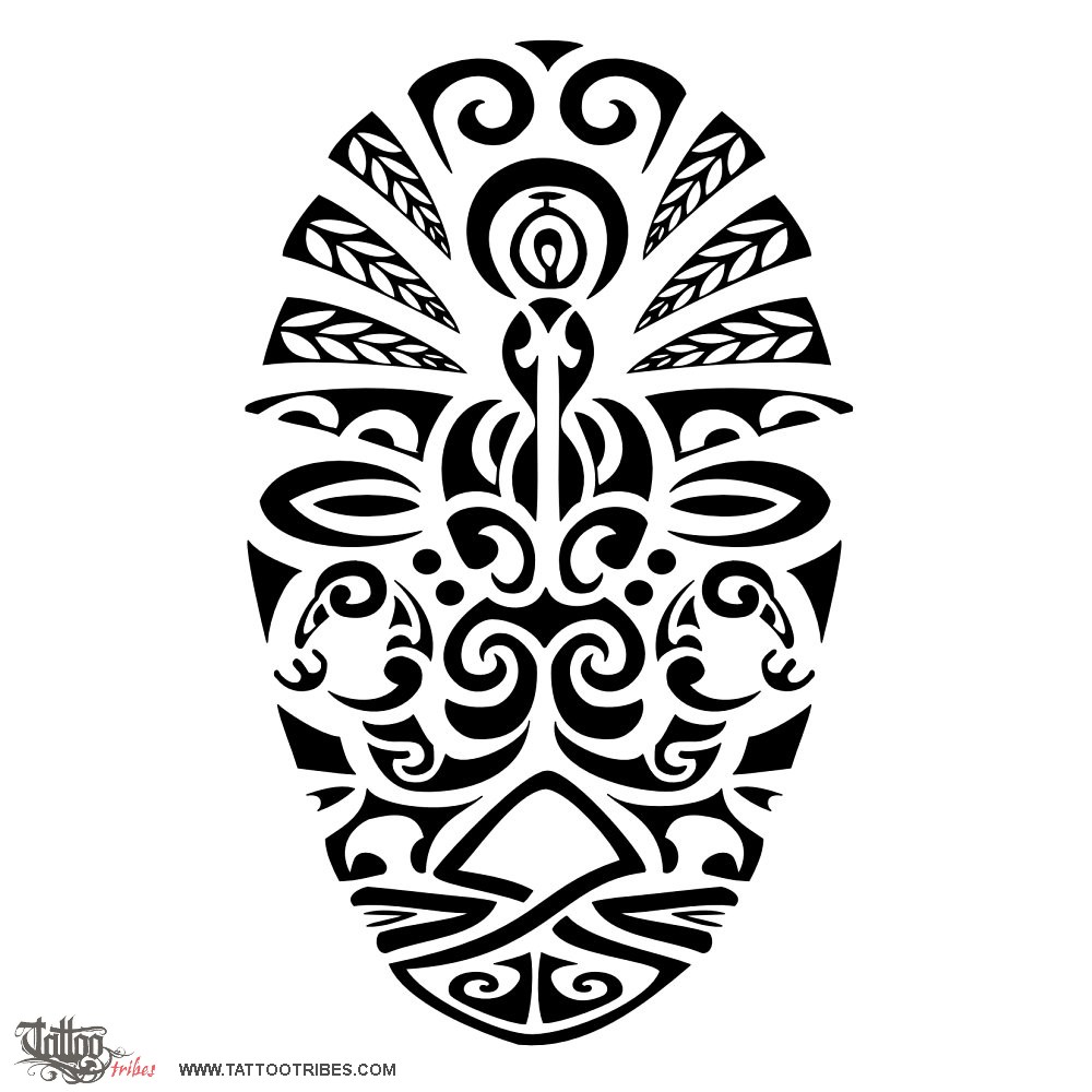 The warrior mask represents ancestors, tradition and courage, and the eyes placed on the turtle´s sides want to represent here ancestors guarding the family, as guardian angels (the te manaias just below). The lower twist symbolizes true love, and tikis are meant for protection.